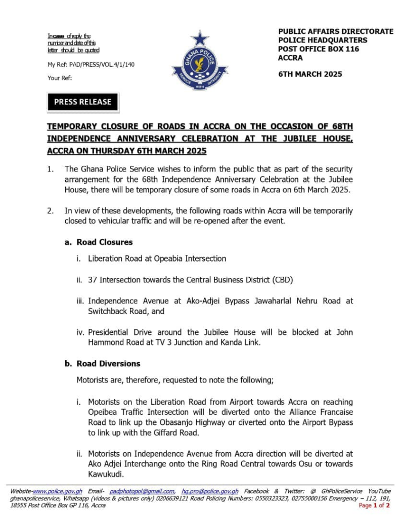The Ghana Police Service has announced the temporary closure of several public roads in Accra on Thursday, March 6, 2025, as part of security arrangements for Ghana’s 68th Independence Day anniversary.