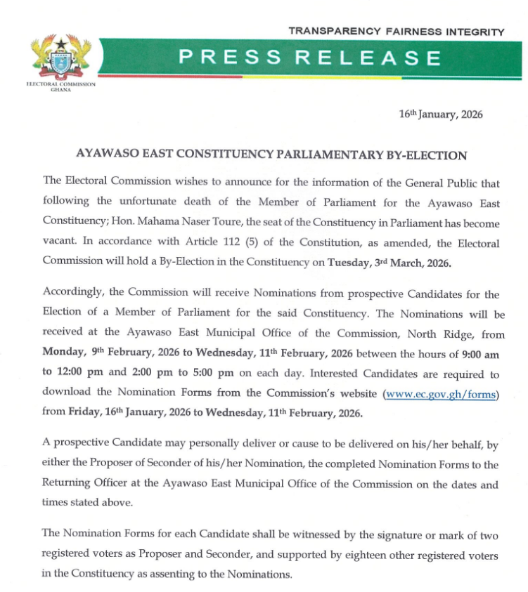 The Electoral Commission (EC) has announced Tuesday, March 3, 2026, as the date for a parliamentary by-election in the Ayawaso East Constituency, setting in motion a tightly scheduled process to fill the vacant seat following the death of the area’s Member of Parliament, Hon. Mahama Naser Toure.