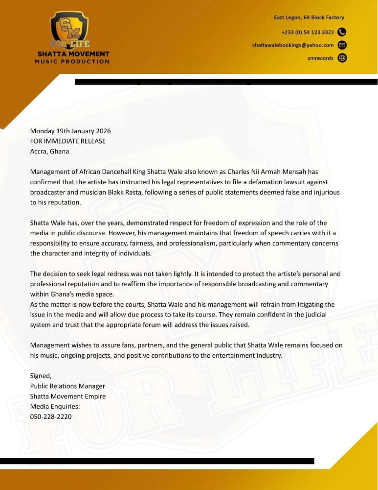 In a press statement released on Monday, January 19, 2026, Shatta Wale’s management confirmed the legal action, emphasizing that the decision was not taken lightly. The statement read: