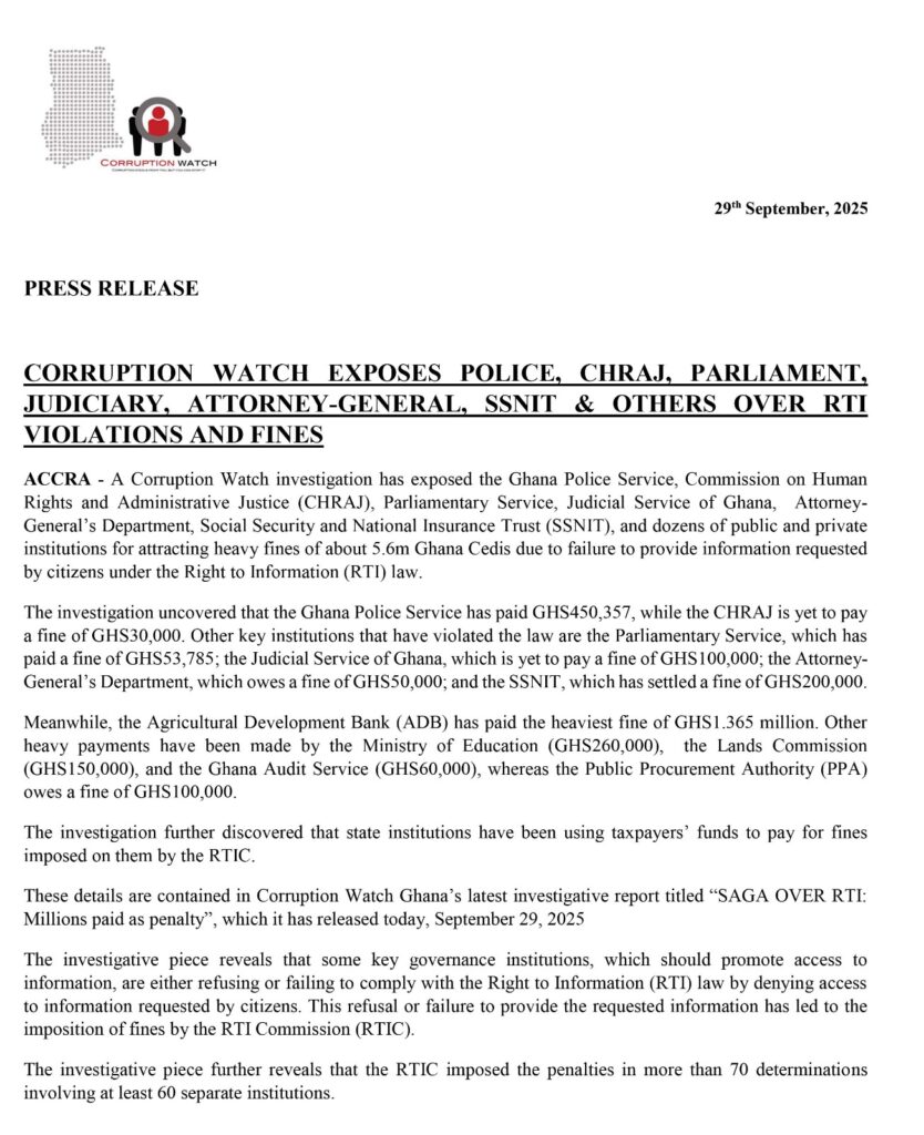 The six-month investigation, conducted between February and July 2025, revealed that more than 70 determinations by the RTI Commission (RTIC) have led to fines totalling about GHC5.6 million against at least 60 public and private institutions.