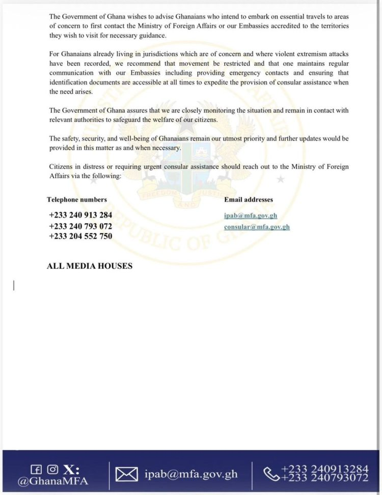 The Ministry emphasized: “The safety, security, and well-being of Ghanaians remain our utmost priority. We are closely monitoring the situation and will provide further updates as necessary.”