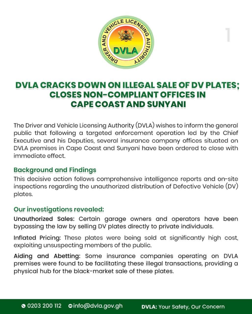 The Driver and Vehicle Licensing Authority (DVLA) has shut down several insurance company offices operating on its premises in Cape Coast and Sunyani following a targeted enforcement operation into the illegal sale of Defective Vehicle (DV) plates.
