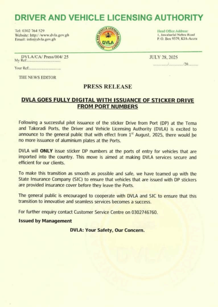 The Driver and Vehicle Licensing Authority (DVLA) has announced that, beginning August 1, 2025, it will cease the issuance of aluminium ‘Drive from Port’ (DP) number plates at Ghana’s ports.