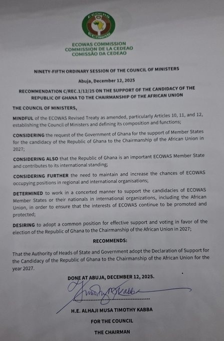 • ECOWAS Council of Ministers Endorse President Mahama For AU Chairmanship In 2027 12 December 2025