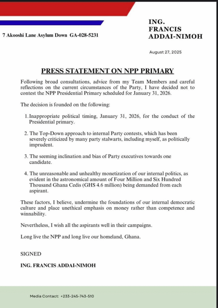 In a press release issued on August 27, 2025, Addai-Nimoh explained that the decision followed broad consultations with his team and careful reflection on the state of the party.