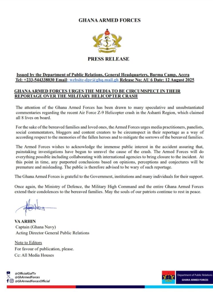The Ghana Armed Forces (GAF) has urged media practitioners, social commentators, bloggers, and content creators to exercise restraint and accuracy in reporting on the recent Air Force Z-9 helicopter crash in the Ashanti Region, which claimed the lives of all eight personnel on board.