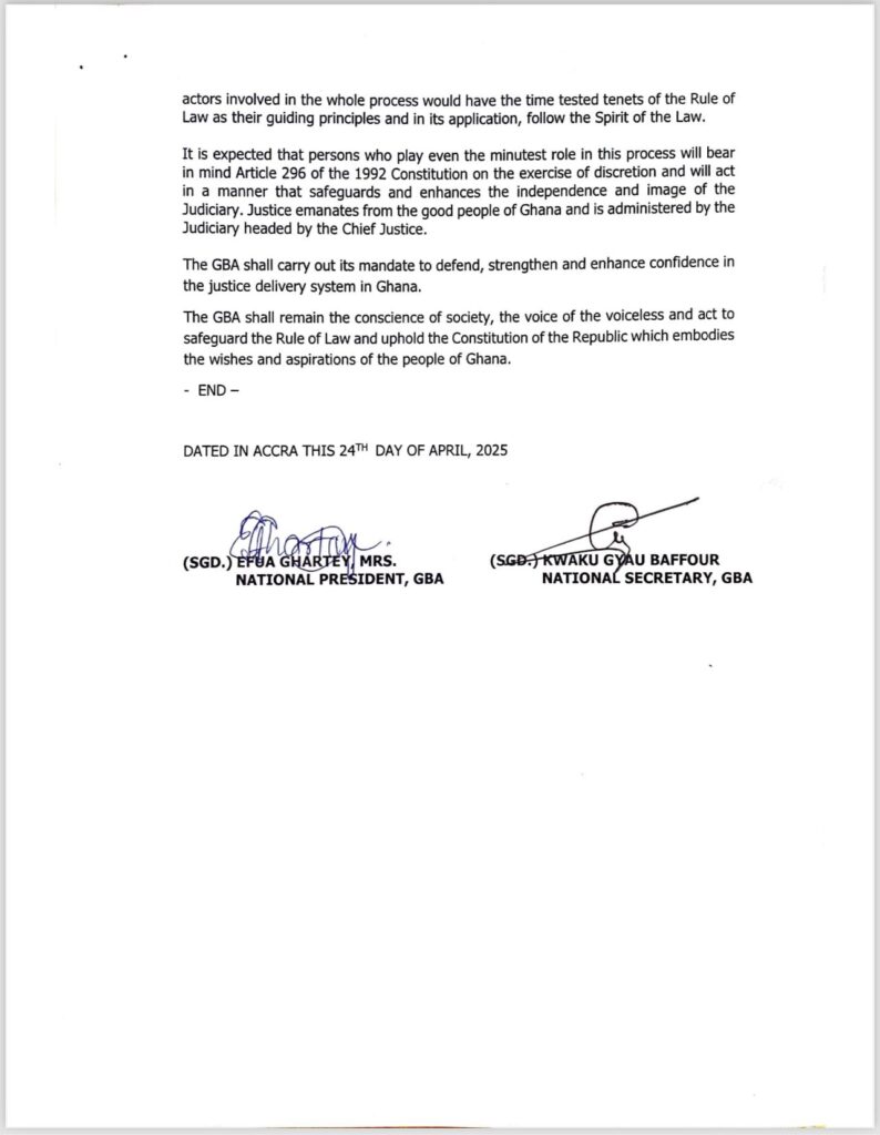 “It is expected that persons who play even the minutest role in this process will act in a manner that safeguards and enhances the independence and image of the Judiciary,” the GBA noted, referencing Article 296 on the responsible exercise of discretionary power.