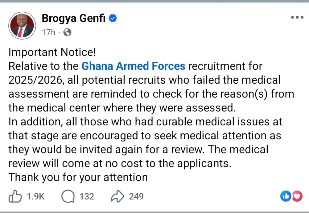 In a statement shared on Facebook, Genfi encouraged candidates who were disqualified during the medical stage of the 2025/2026 enlistment to revisit the medical centres where they were initially assessed to understand the reasons for their disqualification.