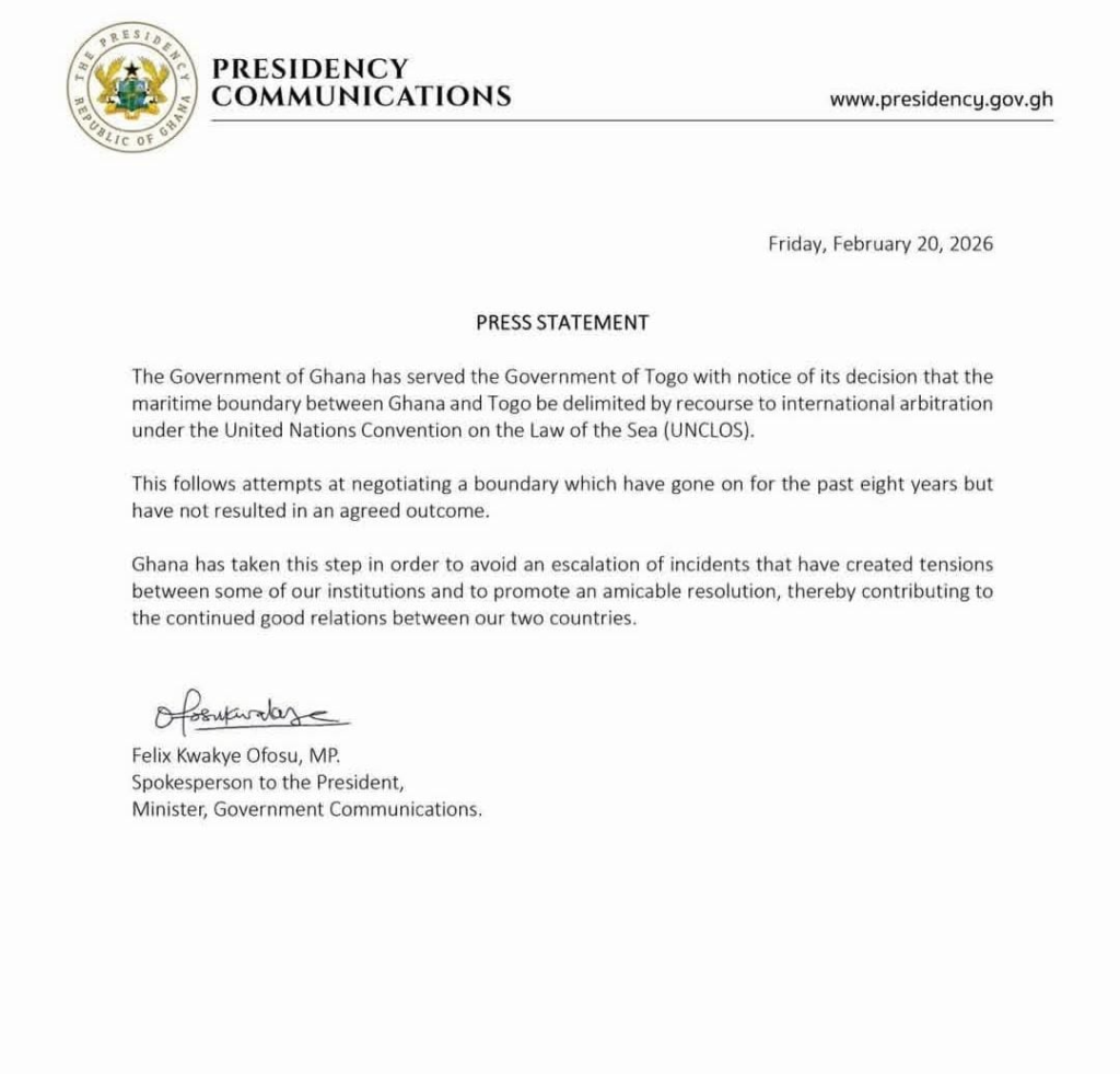 The Government of Ghana has formally notified the Government of Togo of its decision to submit the longstanding maritime boundary dispute between the two countries to international arbitration under the United Nations Convention on the Law of the Sea (UNCLOS).