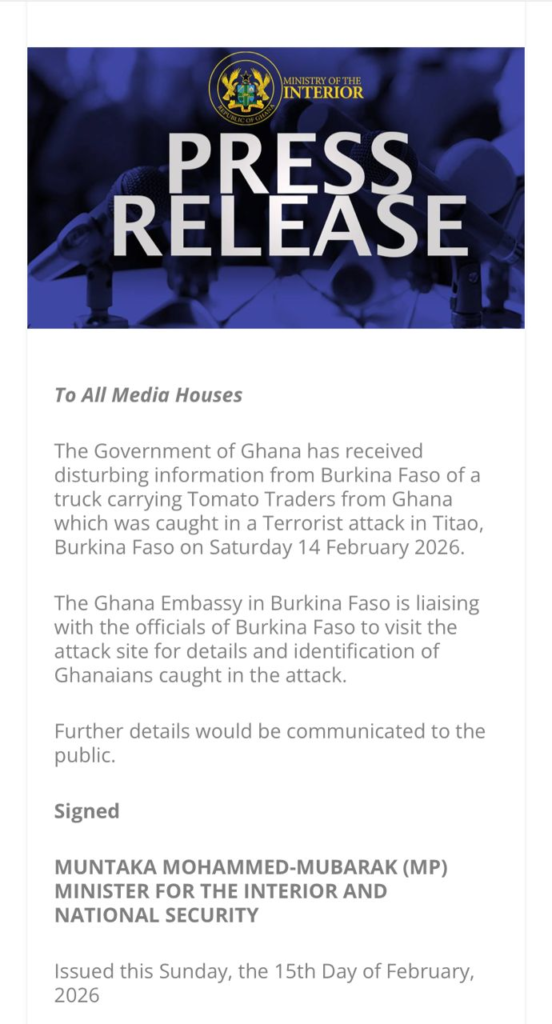 “The Government of Ghana has received disturbing information from Burkina Faso of a truck carrying tomato traders from Ghana which was caught in a terrorist attack in Titao, Burkina Faso on Saturday 14 February 2026,” the statement said.