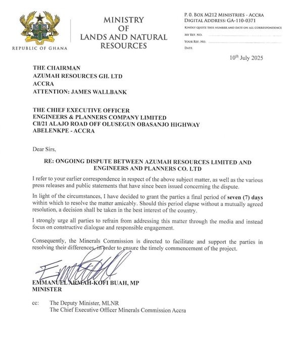 The Ministry of Lands and Natural Resources has issued a seven-day ultimatum to Azumah Resources Pty Ltd and Engineers & Planners (E&P) to resolve their dispute over the $100 million Black Volta Gold Project.