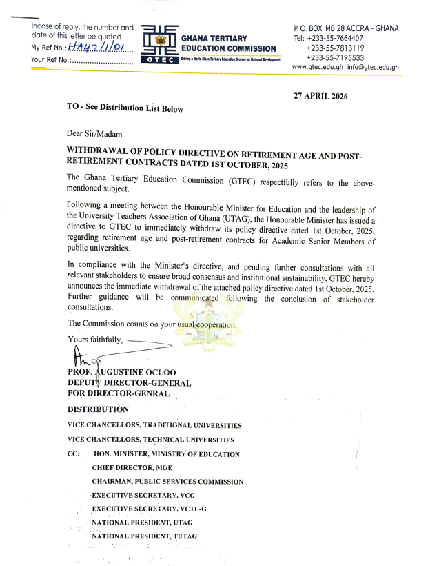In a letter dated April 27, 2026, GTEC said the decision follows a meeting between the Minister for Education and the leadership of the University Teachers Association of Ghana (UTAG). The Minister subsequently directed the Commission to withdraw the policy, which had been issued on October 1, 2025.