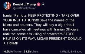 “Iranian Patriots, KEEP PROTESTING – TAKE OVER YOUR INSTITUTIONS!!! Save the names of the killers and abusers. They will pay a big price,” he wrote, adding that he had cancelled meetings with Iranian officials until the killings stop.
