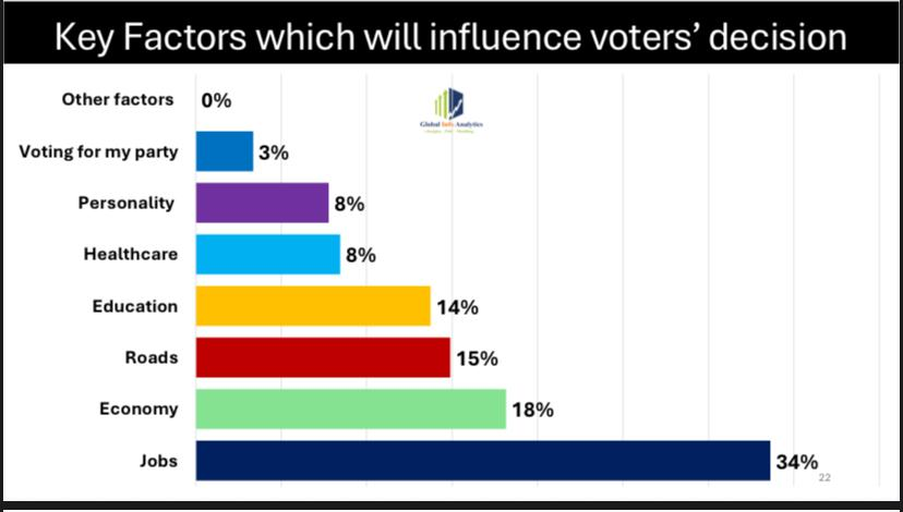 The poll identifies jobs as the most important issue influencing voters’ choices in the re-run election, cited by 34 per cent of respondents. This is followed by the economy (18 per cent) and roads (15 per cent), underscoring the central role of bread-and-butter issues in the campaign.