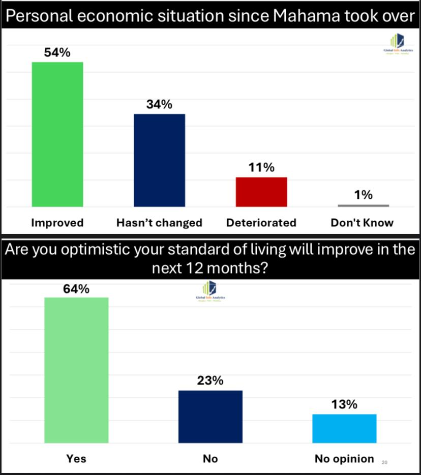 Economic perceptions also appear largely positive. More than half of respondents (54 per cent) said their personal economic situation has improved since President John Dramani Mahama took office, 34 per cent said it has not changed, and 11 per cent said it has deteriorated.