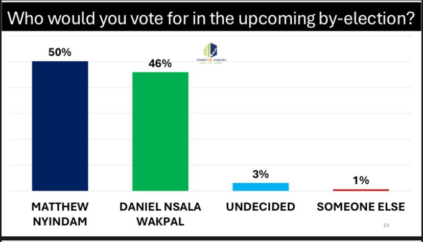 The survey also reveals limited voter movement between the two leading candidates, with two percent of Nyindam’s previous voters switching to Wakpal and an equal proportion moving in the opposite direction.