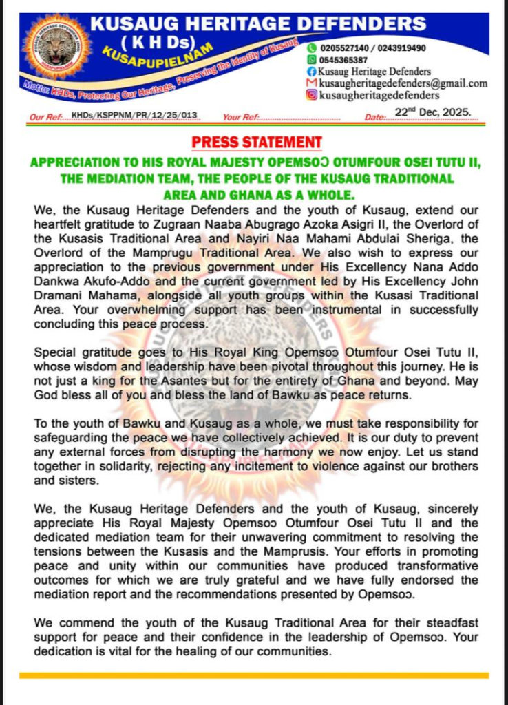 The Kusaug Heritage Defenders and the youth of Kusaug have expressed appreciation to His Royal Majesty Opemsuo Otumfuo Osei Tutu II and members of the mediation team for their role in resolving tensions between the Kusasis and the Mamprusis.