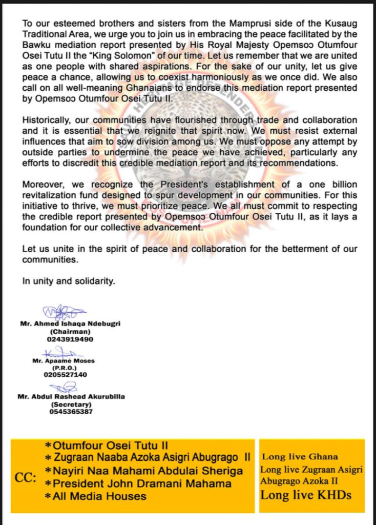 In a press statement, the group extended gratitude to the Overlord of the Kusasis Traditional Area, Zugraan Naaba Abugrago Azoka Asigri II, and the Overlord of the Mamprugu Traditional Area, Nayiri Naa Mahami Abdulai Sheriga, describing their support as critical to the peace process.