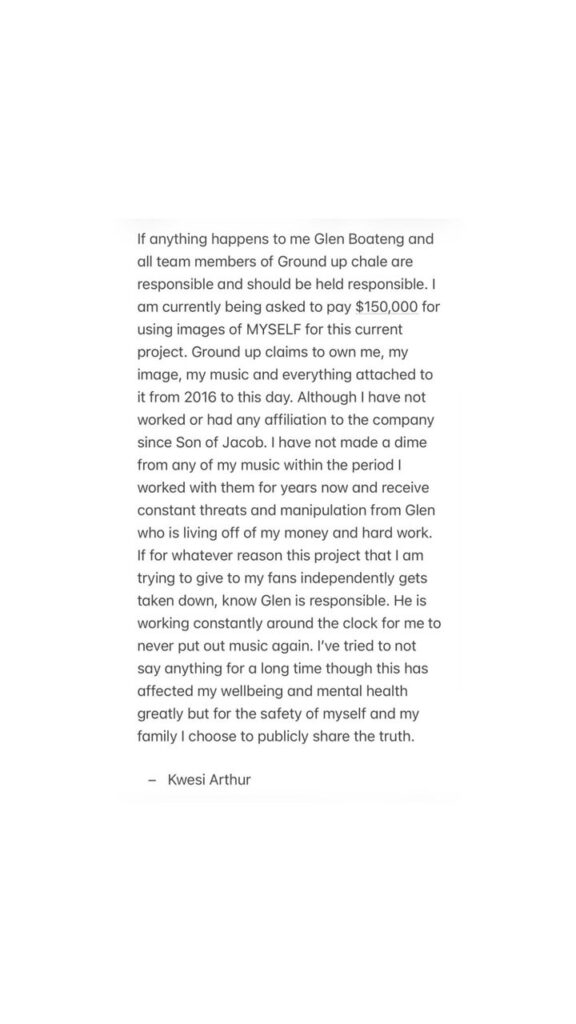 In one of the most alarming part of the public statement, Kwesi Arthur raised concerns about his personal safety, stating that Glen Boateng and members of Ground Up Chale should be held responsible if anything happens to him.