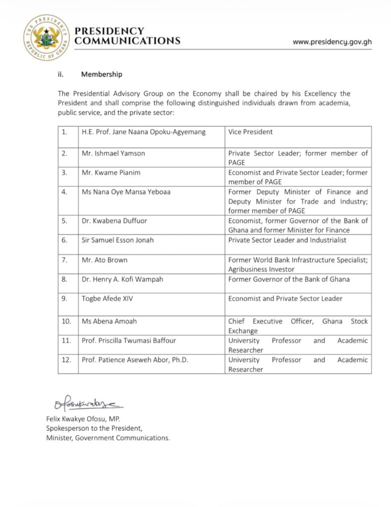 Signing the statement, Minister for Government Communications and Spokesperson to the President, Felix Kwakye Ofosu, said the composition of the Group reflects government’s resolve to “bring together experience, expertise and credibility in charting a resilient and sustainable economic path for Ghana.”
