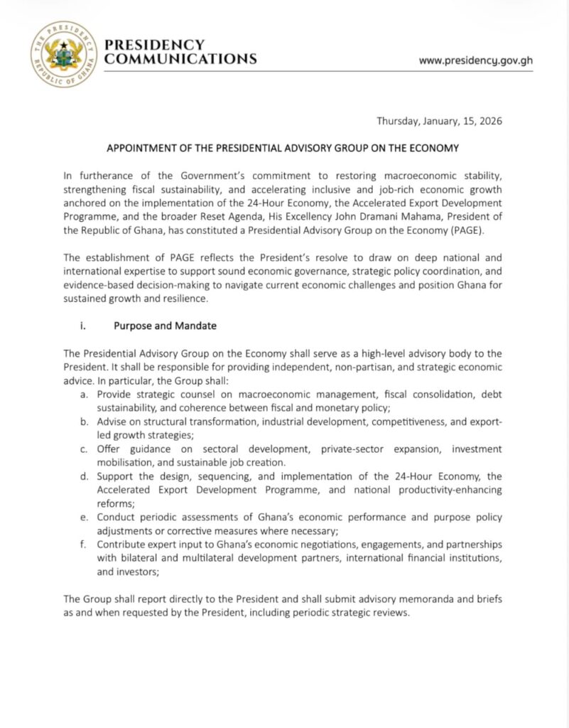 “The Group will support the design, sequencing and implementation of major productivity-enhancing reforms, including the 24-Hour Economy and the Accelerated Export Development Programme,” the Presidency noted, adding that PAGE will conduct periodic assessments of Ghana’s economic performance and propose corrective measures where necessary.