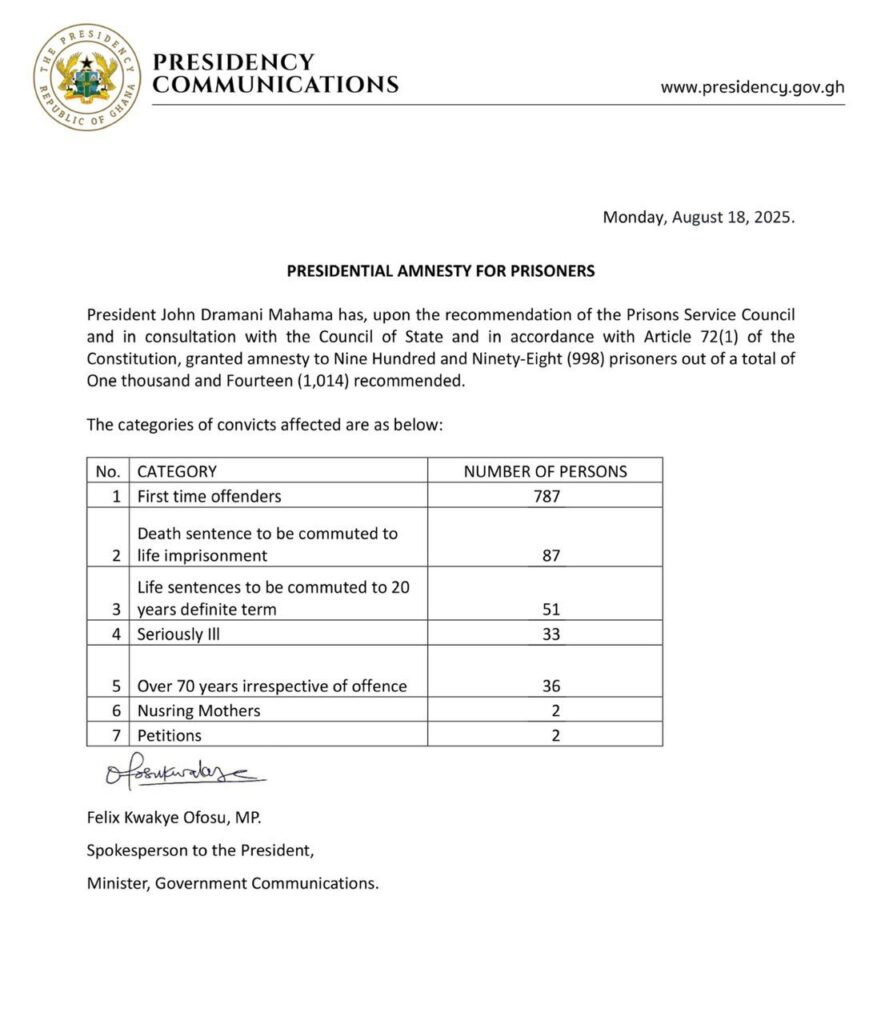 A statement dated August 18, 2025, signed by Felix Kwakye Ofosu, Spokesperson to the President and Minister of Government Communications, said the amnesty was in line with Article 72 (1) of the 1992 Constitution, which empowers the President to grant pardons, reprieves, or commute sentences.