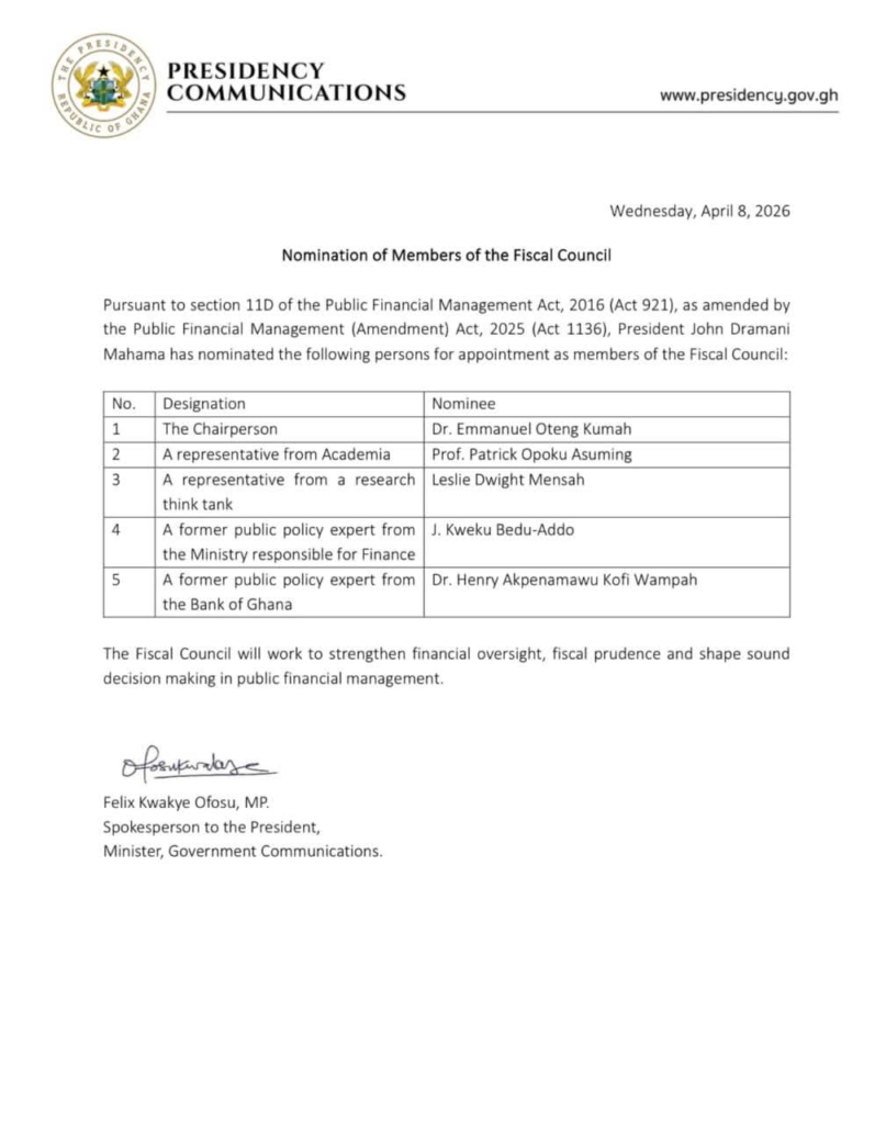 President John Dramani Mahama has nominated five individuals for appointment to Ghana’s Fiscal Council, in line with provisions under the Public Financial Management Act, 2016 (Act 921), as amended.