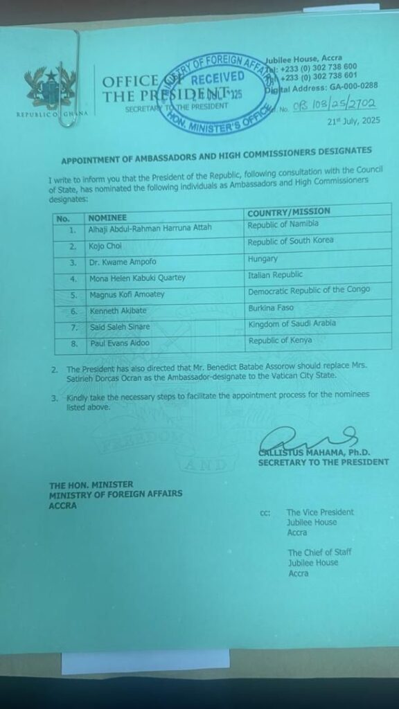 A formal communication issued by the Secretary to the President, Dr. Callistus Mahama, detailed the nominees and their respective destinations.