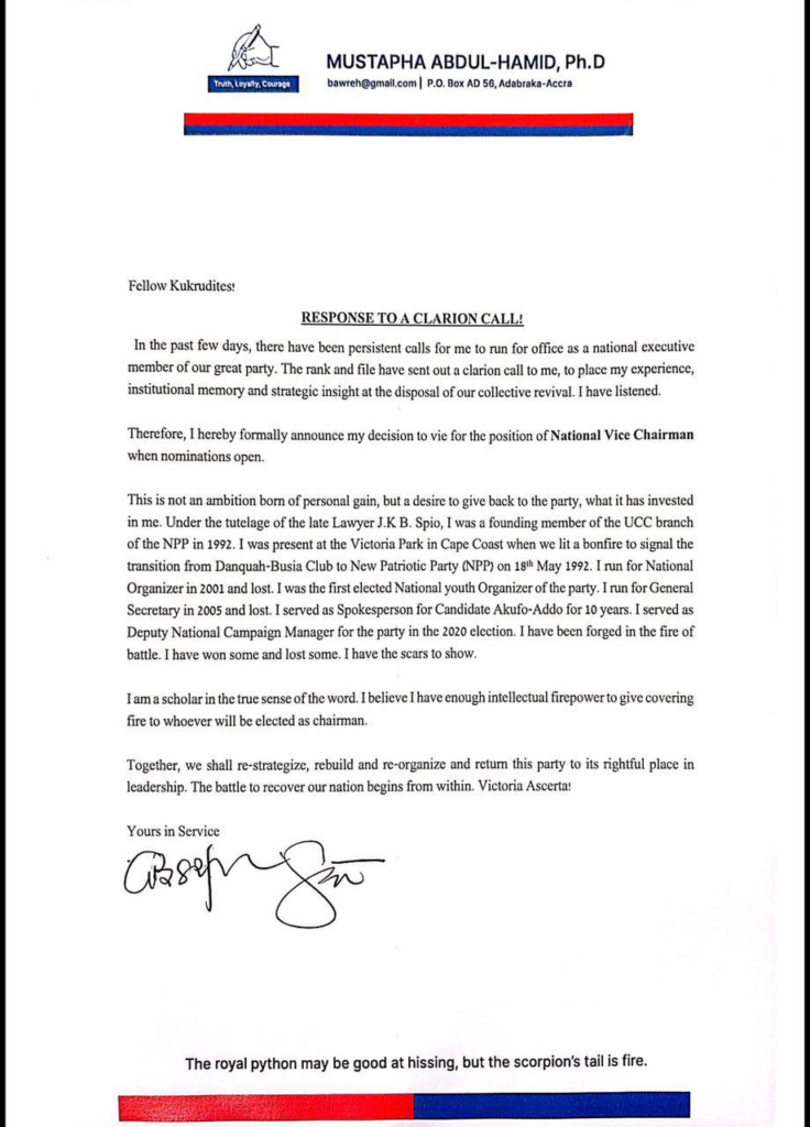 A former government spokesperson, Mustapha Abdul-Hamid, has formally announced his intention to contest for the position of National Vice Chairman of the New Patriotic Party (NPP), citing growing calls from party grassroots and supporters.