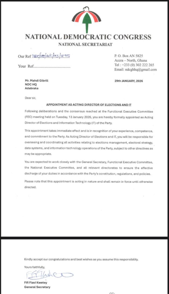 The appointment was confirmed in an official letter dated January 29, 2026, and signed by the NDC’s General Secretary, Fifi Fiavi Kwetey . According to the letter, the decision followed deliberations and a consensus reached at a Functional Executive Committee (FEC) meeting held on Tuesday, January 13, 2026.