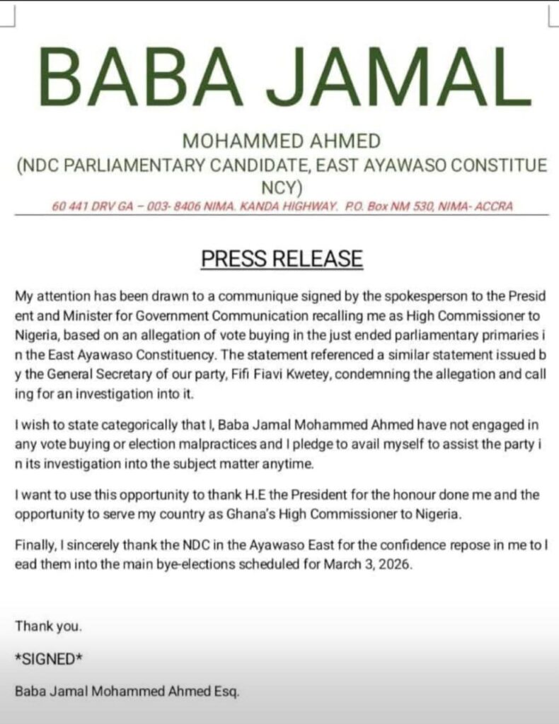 The National Democratic Congress parliamentary candidate for Ayawaso East, Mohammed Baba Jamal Ahmed, has refuted claims of engaging in vote buying during the Ayawaso East parliamentary primary held on February 7, 2026.