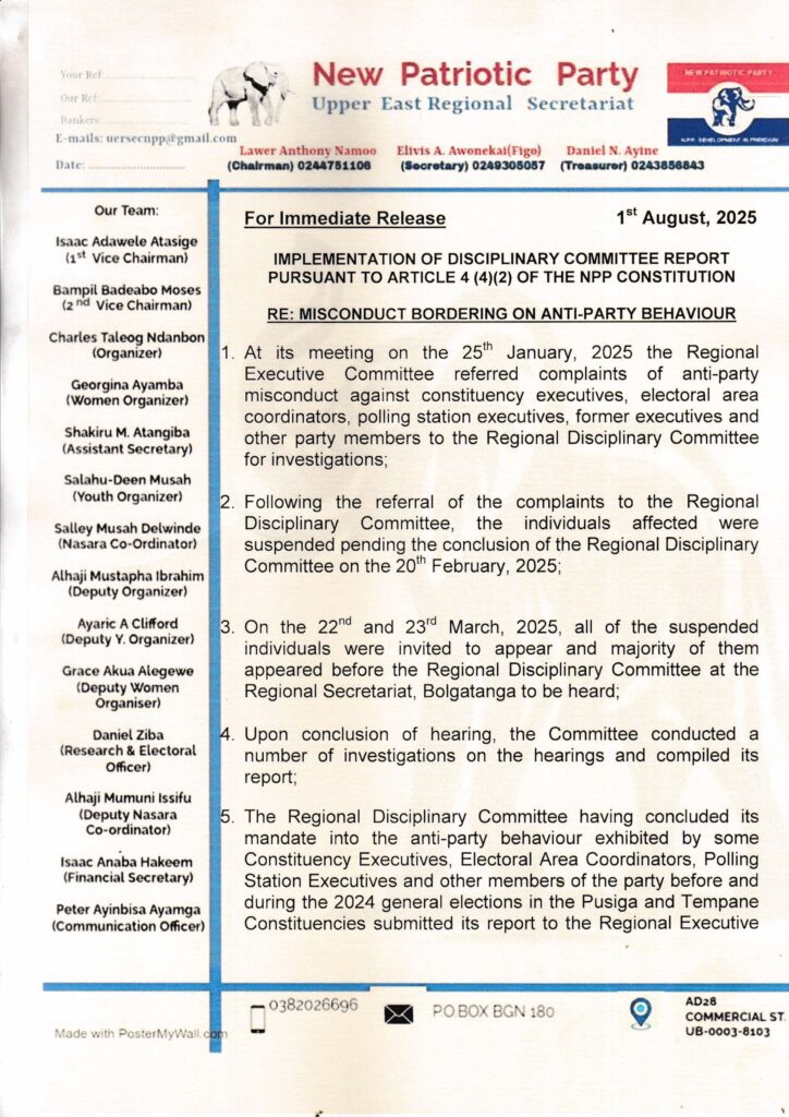 The New Patriotic Party (NPP) in the Upper East Region has taken disciplinary action against 16 of its members and officials from the Pusiga and Tempane constituencies for various misconducts tied to the 2024 general elections.
