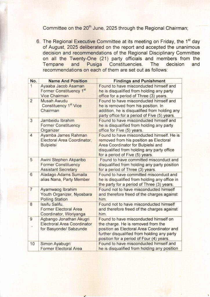 The sanctions varied based on the gravity of each case. Six executives, including 1st Vice Chairman Musah Awudu and Treasurer Jacob Akazusah, have been removed from their positions and handed a five-year ban from holding any office.