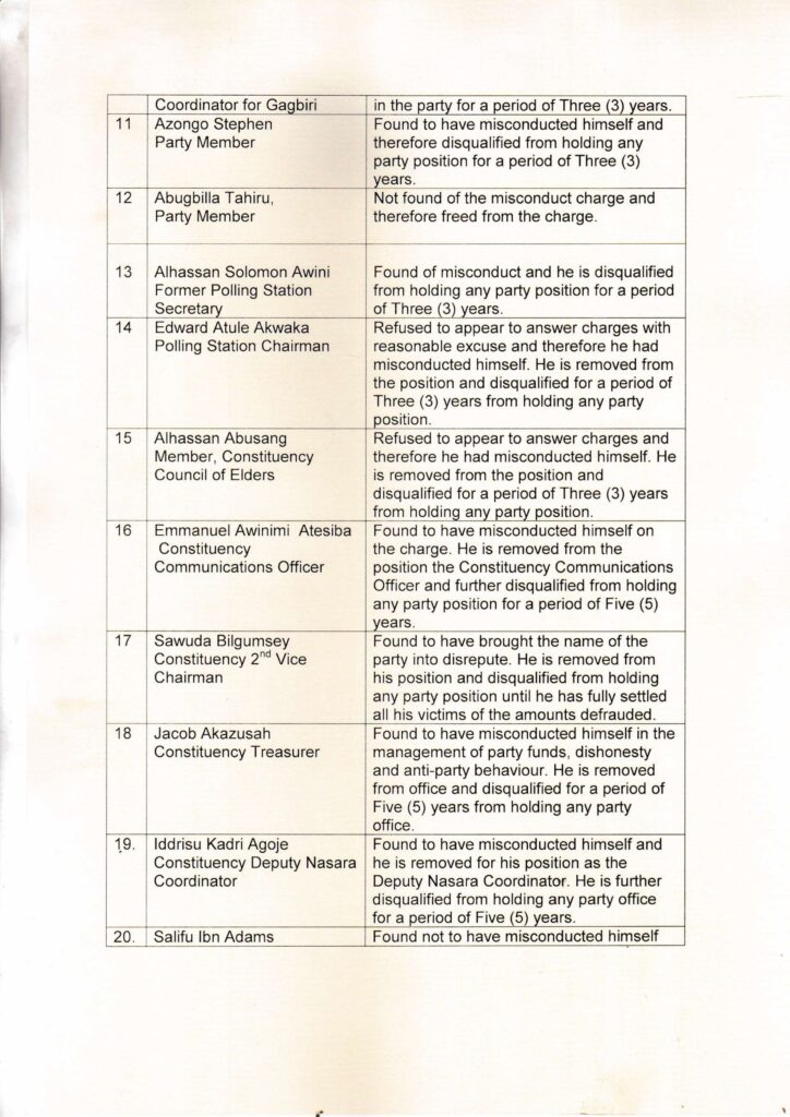 At the top of the list is Sawuda Bilgumsey, the 2nd Vice Chairman of the party, who has been dismissed and barred from holding any party position until he reimburses party funds allegedly misused.