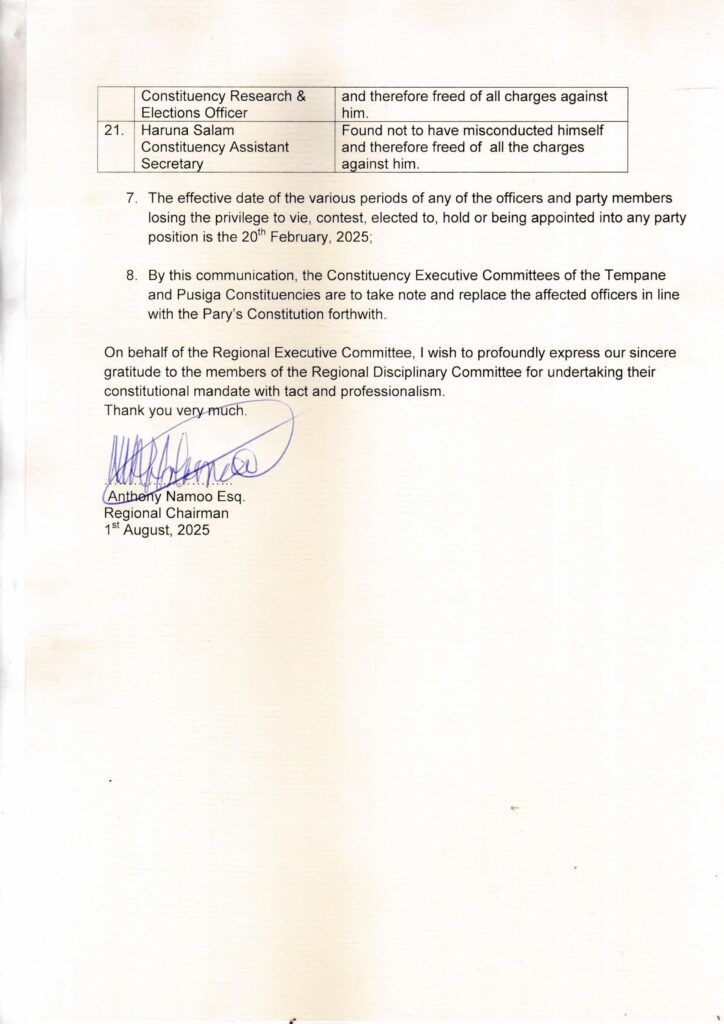 The sanctions were announced in a statement released by Regional Chairman Anthony Namoo on August 1, 2025, following the conclusion of a months-long investigation by the party’s Regional Disciplinary Committee.