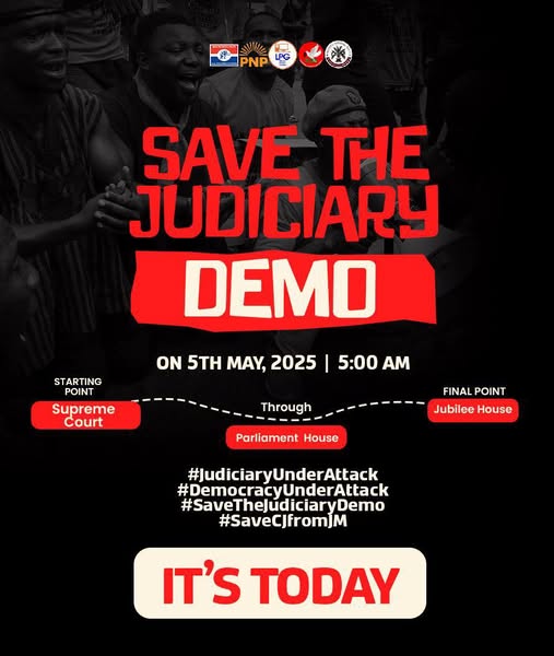 A coalition of political parties, led by the New Patriotic Party (NPP), is set to stage a demonstration in Accra today, May 5, in protest against the controversial suspension of Chief Justice Gertrude Torkornoo.