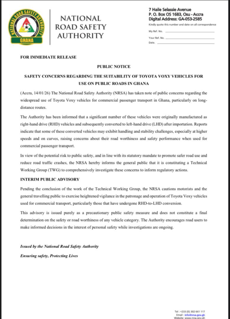 The National Road Safety Authority (NRSA) has issued a public notice highlighting potential safety risks associated with the use of Toyota Voxy vehicles for commercial passenger transport in Ghana.