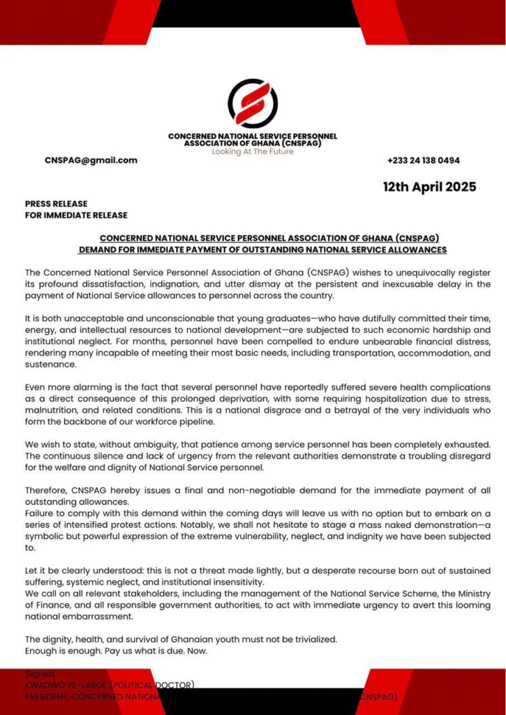 The Concerned National Service Personnel Association of Ghana has issued a strongly worded demand for the immediate payment of all outstanding national service allowances, expressing frustration over what it describes as prolonged neglect and hardship faced by personnel across the country.