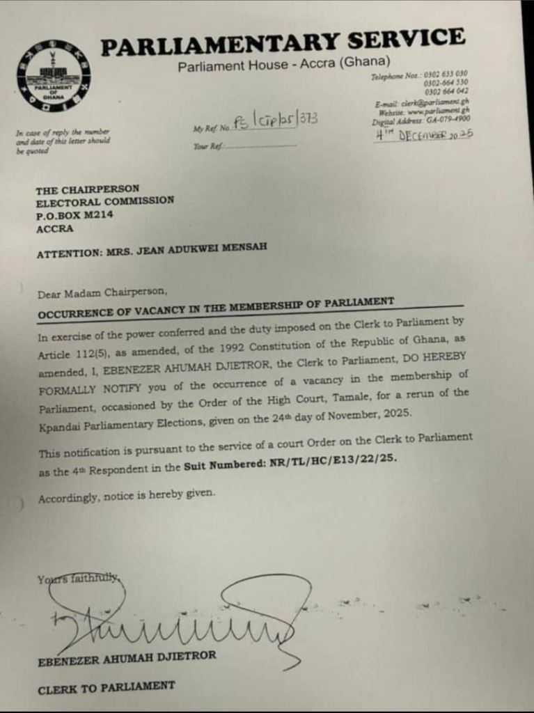 In the letter, the Clerk formally notified the EC of the vacancy “occasioned by the Order of the High Court, Tamale, for a re-run of the Kpandai Parliamentary Elections,” referencing Suit Number NR/TL/HC/E13/22/25, in which the Clerk was listed as the 4th Respondent.
