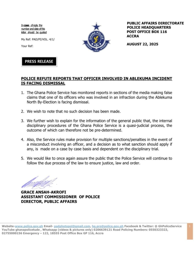 “The Ghana Police Service has monitored reports in sections of the media making false claims that one of its officers who was involved in an infraction during the Ablekuma North By-Election is facing dismissal. We wish to note that no such decision has been made,” the statement clarified.
