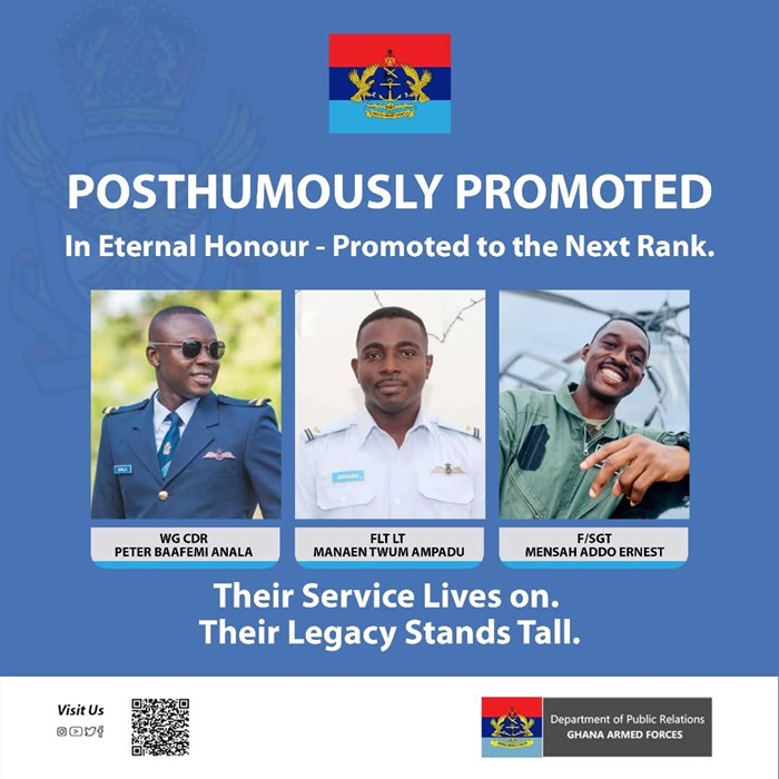 Under the posthumous promotions, Squadron Leader Anala has been elevated to Wing Commander, Flying Officer Twum-Ampadu promoted to Flight Lieutenant, and Sergeant Mensah promoted to Flight Sergeant.