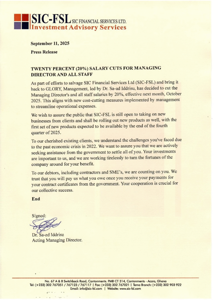 The Managing Director of SIC Financial Services Limited (SIC-FSL), Dr. Sa-ad Iddrisu, together with all staff of the company, will take a 20 per cent salary cut beginning October 2025 as part of measures to restore the struggling firm.