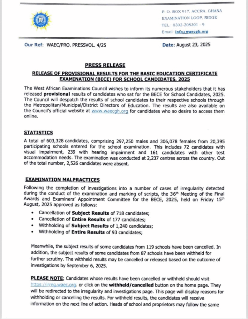 The West African Examinations Council (WAEC) has officially released the 2025 Basic Education Certificate Examination (BECE) provisional results.