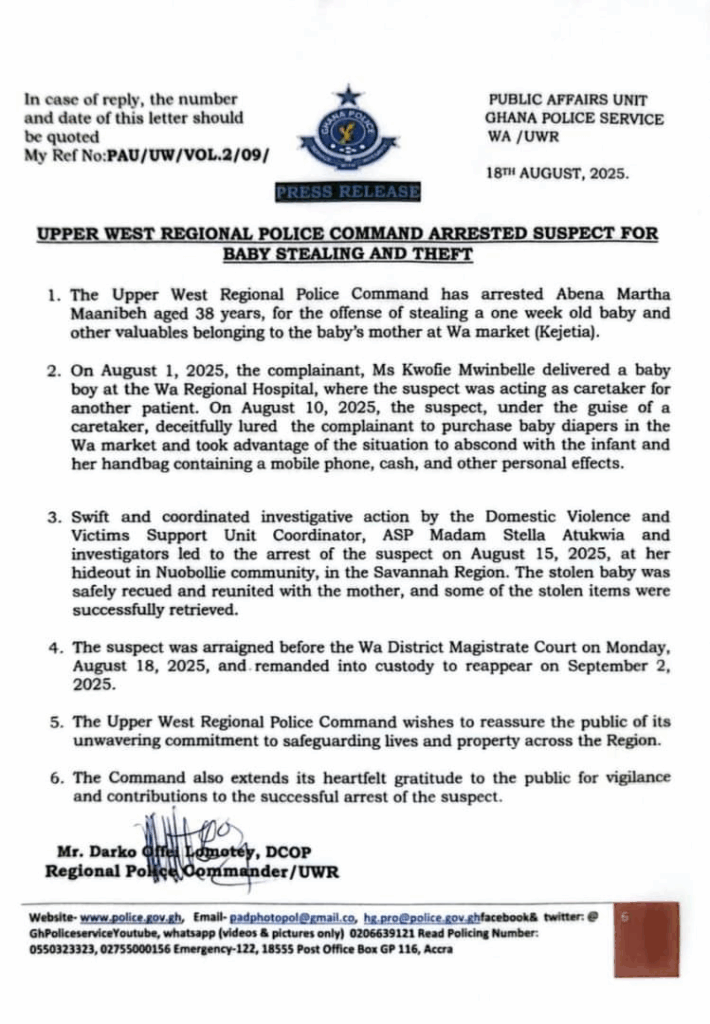 According to police, the suspect had posed as a caretaker at the Wa Regional Hospital, where she befriended the child’s mother, Ms. Kwofie Mwinbelle, shortly after she delivered on August 1.
